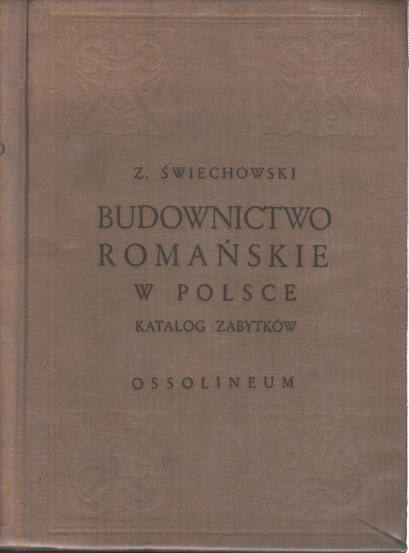 Budownictwo romańskie w Polsce : katalog zabytków / Zygmunt Świechowski. - Wrocław [i in.] : Zakład Narodowy im. Ossolińskich, 1963. - 428 s., [540] s. tabl., [3] k. złoż. tabl. : fot., mapki, pl. ; 25 cm.