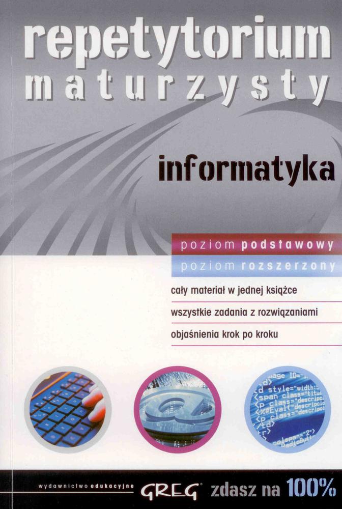 Repetytorium maturzysty informatyka to pierwsza na rynku wydawniczym książka odpowiadająca na zapotrzebowania uczniów pragnących zdawać egzamin maturalny z informatyki. Publikacja jest w pełni zgodna z programem szkolnym i wymaganiami maturalnymi. Ponadto zawiera całość koniecznego materiału na poziomie podstawowym oraz rozszerzonym. Niewątpliwym atutem Repetytorium... są liczne przykłady pracy z omawianymi programami. Bogate, szczegółowe objaśnienia wraz ze zdjęciami ilustrującymi każdy krok ułatwiają i przyspieszają naukę. Również zagadnienia teoretyczne zostały zaprezentowane w czytelny i interesujący sposób, zachęcający do nauki przedmiotu. Pomocą w poruszaniu się po Repetytorium... jest dokładny indeks pojęć.