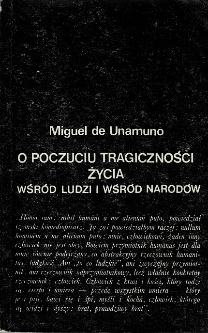 Szkic "O poczuciu tragiczności życia wśród ludzi i wśród narodów", który niniejszym oddajemy w ręce polskich czytelników, stanowi jedno ze szczytowych osiągnięć hiszpańskiej eseistyki filozoficznej. Miguel de Unamuno (1864-1936), wybitny przedstawiciel tzw. "pokolenia 98", znany był dotąd w Polsce głownie jako powieściopisarz, a jego prace filozoficzne - na które, podobnie jak dzieła Ortegi y Gasseta, wielokrotnie się powoływano - docierały do nas jedynie w postaci cytatów i omówień. Autor przedstawia w swym szkicu egzystencjalną koncepcję człowieka jako bytu konkretno-jednostkowego, przenikniętego trwogą przed nicością i uwikłanego w nie kończący się konflikt wewnętrzny między pragnieniem wiary w Boga jako gwaranta nieśmiertelności osobistej, a niemożnością wiary wynikającą z racji rozumowych. /z okł./
