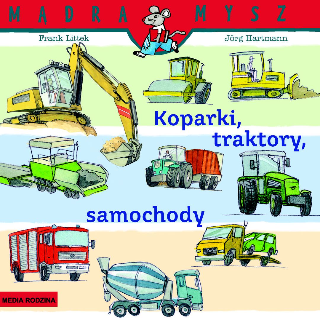 Książeczka edukacyjno-rozrywkowa, w której Mądra Mysz zapoznaje dzieci z maszynami i pojazdami używanymi do różnych celów.