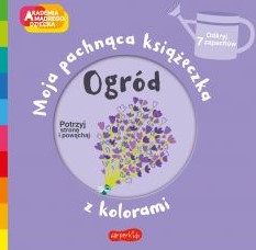 Książeczka uczy kolorów, pokazuje przedmioty w danej brawie, a dodatkowo każda prawa strona po potarciu obrazka pachnie. W tytule Ogród przedstawiamy zapachy: lawendy, cytryny, jaśminu, róży, pomarańczy, mięty i kwiatów bzu.