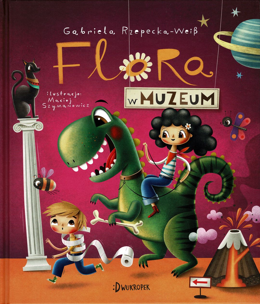 Kolejna z serii książek o Florze i jej rodzinie. Nudno? Wybierz się z Florą do muzeum! Tu w jednym miejscu znajdziesz całe mnóstwo atrakcji. Stań oko w oko z potężnym T-Rexem. Wskocz na puchaty grzbiet trzmiela – i leeeeeć… A może wolisz polatać balonem, śmigłowcem albo nawet rakietą? Nie bój się egipskich ciemności, śmiało wkrocz do piramidy i zapisz swoje imię hieroglifami. Przepłyń się łodzią Wikingów, zatańcz taniec hula i pomedytuj z tybetańskimi mnichami. Odkryj skarby wnętrza Ziemi i zakamarki ludzkiego ciała. Uważaj tylko na tygrysa szablozębnego, strzały Mongołów, wybuchające wulkany i… pierdziuszki. A na koniec stwórz własną gablotę muzealną. Miłego zwiedzania!