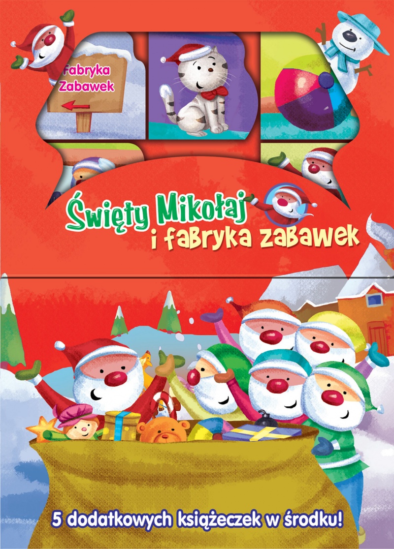 Święty Mikołaj i fabryka zabawek. - Warszawa : Wydawnictwo Zielona Sowa, copyright 2013. - [12] stron : ilustracje kolorowe ; 30 cm + 5 książeczek : 8 stron ; 6 cm.